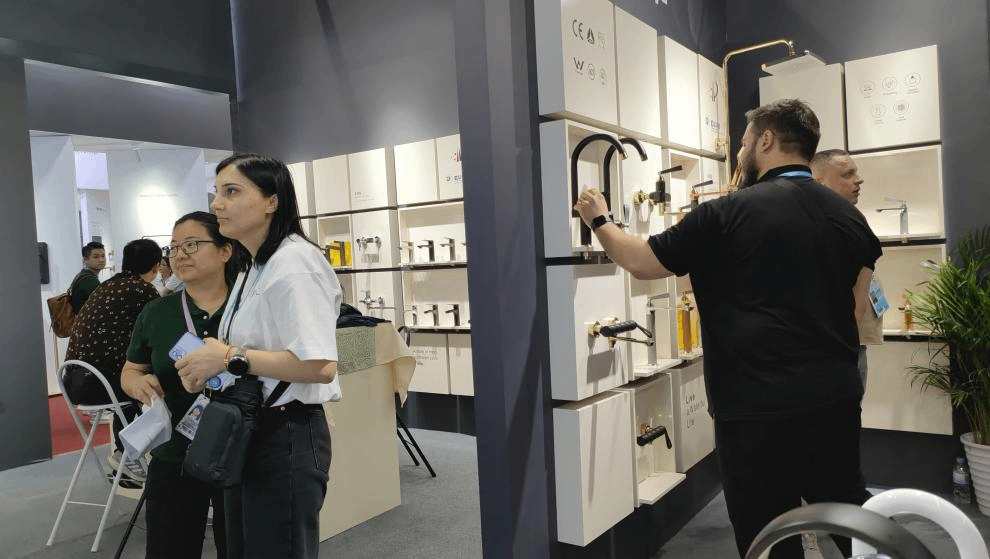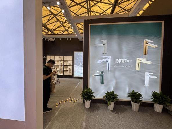 O estande branco limpo da marca era um verdadeiro olho, misturando esculturas leves com design espacial inteligente para criar uma atmosfera pura e calmante. Essa aparência correspondeu ao foco do Kingsdom em sistemas de água limpa e materiais ecológicos. Eles até trouxeram a natureza para dentro com paredes verdes vivas misturadas em exibições de produtos, combinando design moderno com um toque do ar livre.